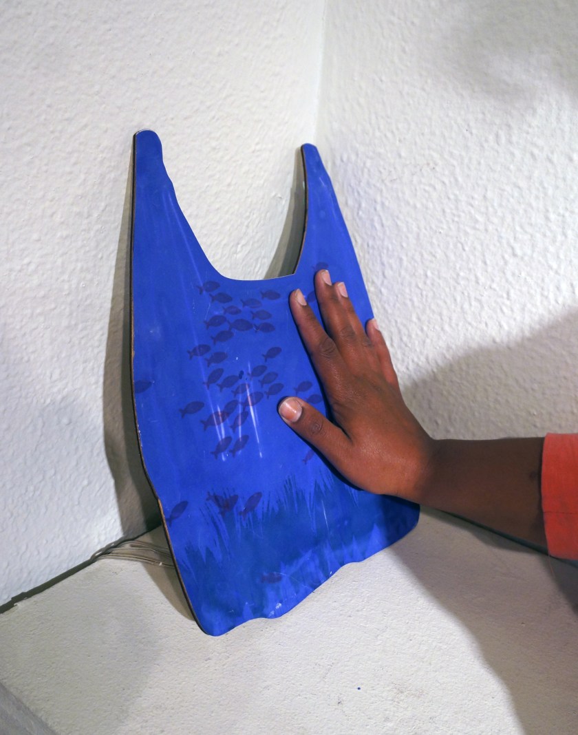 I am interested in the interactive quality of this ink and creating works of art that engage the viewer. I have produced a piece that will create a conversation about how humans affect the environment. More specifically, how our synthesized plastics affect the environment. The top layer of the print is a flat of the thermal ink, which the viewer is invited to touch to see the affects of human activity and question their involvement in the issue. When the thermal ink comes into contact with body heat from the viewer, it goes clear revealing the images underneath. The image revealed in my piece is of a marine habitat that is affected by the presence of plastic. In addition to the body heat from the viewer, muscle wire connected to electronics heat up periodically creating lines that hint to the image that is hidden. My hope is that this will create a conversation about the implications of human consumption and waste. I also look forward to experimenting more with these interactive inks.