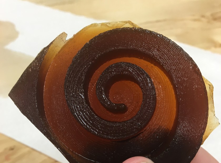 The chocolate tests were mostly successful, with the only notable problem being that the surface detail of the chocolate molds appear to have lumps or pockets in their surfaces. This may be caused by air pockets being stuck under the liquid chocolate as it is poured into the silicone mold, or the type of chocolate that was used (standard chocolate chips) is not designed to remain smooth after being melted and re-solidified.