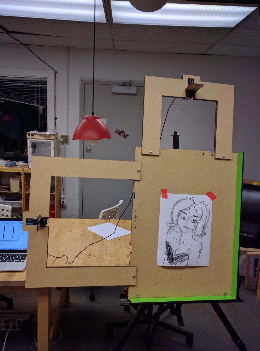 Since the LEAP’s spatial location data is not very accurate, now we are building a new experiment setup. The new system is composed of an easel with two cameras: one to capture the vertical position of the drawing instrument and a second one that captures its horizontal position. A LEAP motion sensor is also used to track the finger and palm during the drawing process. At the end LEAP’s data will be combined with data captured from 2 cameras accurately re-produce the finger and palm movements of the artists. Following image shows our new setup.